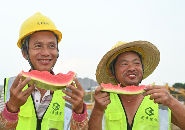 炎熱的天氣里,走訪集團(tuán)公司項(xiàng)目現(xiàn)場(chǎng),許多建設(shè)者堅(jiān)守一線,在不同崗位上揮灑汗水,一幕幕場(chǎng)景,定格成感人的畫面。他們是建設(shè)一線“最美”勞動(dòng)者。 在常州大學(xué)白云校區(qū)項(xiàng)目現(xiàn)場(chǎng),工人們無懼“烤”驗(yàn),在汗流浹背的狀態(tài)下一干就是兩三個(gè)小時(shí),演繹著高溫下的堅(jiān)守。 為確保施工進(jìn)度,一線工人錯(cuò)開最高溫時(shí)段,有條不紊地推進(jìn)施工進(jìn)度。“我們采取‘避中間,抓兩頭’的措施,準(zhǔn)備了充足的防暑降溫藥品和物資,包括藿香正氣水、人丹、清涼油、生理鹽水、大麥茶、西瓜等,既保障工人們的身體健康,又不耽誤工程進(jìn)度。”項(xiàng)目負(fù)責(zé)人許加理介紹說。 一個(gè)大水杯,一條長(zhǎng)毛巾,是工人的標(biāo)配。即便是錯(cuò)開最熱的時(shí)段,其余的時(shí)候也是特別熱,身上的衣服沒有干的時(shí)候,總是濕乎乎的,脫下來一擰,全是水。 在常州飛龍吾悅項(xiàng)目現(xiàn)場(chǎng),鋼筋工一絲不茍地切割著加工臺(tái)上的鋼筋,汗水浸透了他的工服,透出深淺不一的色塊。鋼筋加工是個(gè)精細(xì)活兒,也是個(gè)“危險(xiǎn)活兒”,精力稍不集中,機(jī)械就可能傷到自己。加工出來的鋼筋不符合精度要求,用到工程中也會(huì)“傷”到工程。 百公里外,江蘇南京,G98越城天地項(xiàng)目現(xiàn)場(chǎng)。大型吊裝機(jī)馬達(dá)轟鳴,運(yùn)輸車輛來來往往,工人們正在進(jìn)行主體結(jié)構(gòu)施工。 項(xiàng)目負(fù)責(zé)人唐玉龍?jiān)诟鱾€(gè)工序逐項(xiàng)排查安全隱患,叮囑大家注意事項(xiàng),緊盯每個(gè)施工環(huán)節(jié),在現(xiàn)場(chǎng)常常一待就是一整天。“天氣炎熱,安全隱患容易增多。每一道工序、每一個(gè)施工點(diǎn),我們都要反復(fù)檢查確保萬無一失。”陽光下,豆大的汗珠不停地從他臉頰上滑落。 在項(xiàng)目建設(shè)現(xiàn)場(chǎng),我們看到的是鐵與土的交錯(cuò),是汗與水的交融。當(dāng)一個(gè)個(gè)黝黑的臉龐、一雙雙粗糙的雙手,呈現(xiàn)在我們面前時(shí),我們不由得從心底里向這些“蒸”戰(zhàn)高溫的“最美”勞動(dòng)者致敬。